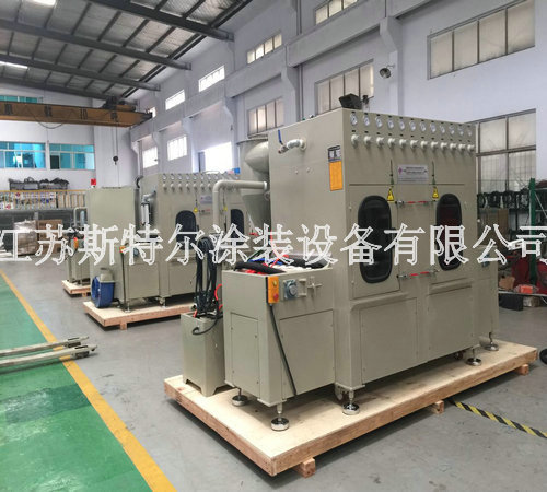 全自動玻璃水砂自動噴砂機由自動上料機、自動噴砂機和自動下料機三大部分組成:首先由自動上料機將附有兩組Tray盤Port可自動交換,需人工放Tray盤至LD Port, Tray盤定位后,移栽Arm開始取片,玻璃整列,再由移栽Arm直接將玻璃放置在載具Stg上,送入噴砂設備,當一個Tray port 取完后,會報警提醒人員裝載新的Tray盤,當空Tray盤滿杯后設備會自動報警通知人員取走空Tray盤,以此循環動作.然后到全自動玻璃水砂自動噴砂機,由人工自行調配一定的水砂比例后設備自動進行混合攪拌,自動上料機構抓取玻璃放到輸送同步帶上,進入噴砂機腔體進行噴砂,噴砂作業結束后,進入水刀處進行噴淋,噴淋結束后由風刀進行吹干。吹干后移動至下料機移栽位置,由移栽將玻璃抓取至下料機FORK上,以此循環。噴砂、清洗、吹干區域有擋邊防止工件位移。最后自動下料機將附有兩組CST Port可自動交換,需人工放空的CST至UnLD Port, CST翻轉90°后,氣缸機械定位,由移栽arm從治具上取玻璃放置Fork上,送入CST, CST Port內的基板利用Fork方式由最高層開始放片,Fork 真空感知Sensor/玻璃光纖sensor OFF后,Fork自動退回到等待位置,以此循環。當CST裝滿后,設備會報警提示人員將CST取走并裝入空的CST。